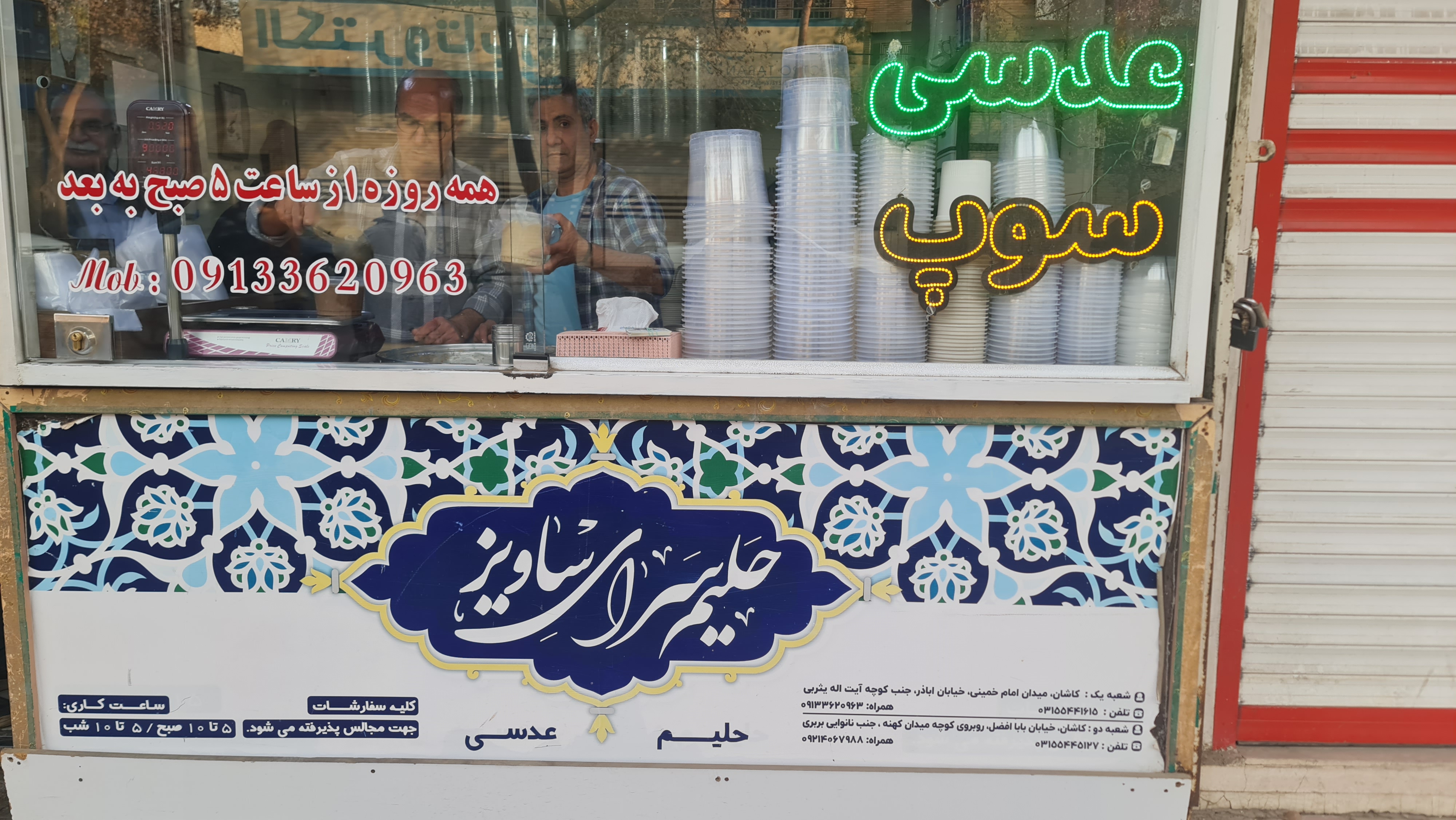 پرسون پرسون خودم رو به آشپزخانه حلیم و آش معروف کاشان رسوندم بنام ساویز.همه فروشندگان کاشان که در اون ساعت صبح باز بودند همگی این حلیم و آش رو بهم پیشنهاد میدادند.خودم رو به اونجا رسوندم و قبل از اینکه برم توی صف و سفارش بدم خوب اطراف اون آشپزخونه رو تماشا کردم و مشتری های اون رو زیر نظر گرفتم و از حجم خرید های اونها متوجه شدم پیشنهادشون بی منطق هم نبوده و مشتریان این آشپزخانه واقعا به طعم و کیفیت اون علاقه دارند.